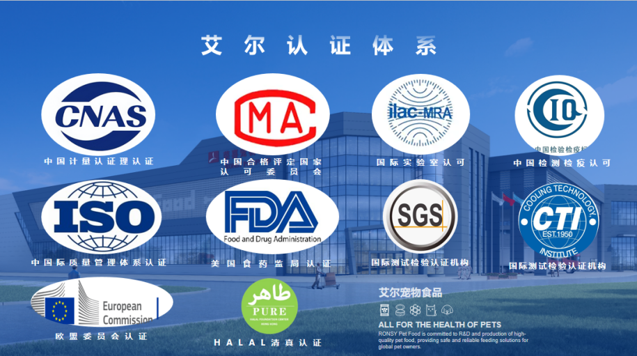 在宠物食品安全备受关注的当下,艾尔宠粮用严苛标准建立信任壁垒,通过CNAS中国计量认证理认证、ISO中国际质量管理体系认证、FDA美国食药监局认证、ILAC·MRA国际实验室认可、SGS国际测试检验认证机构等多项认证,确保每批产品都经过 36 项安全指标检测,重金属、微生物等风险物质均未检出。
